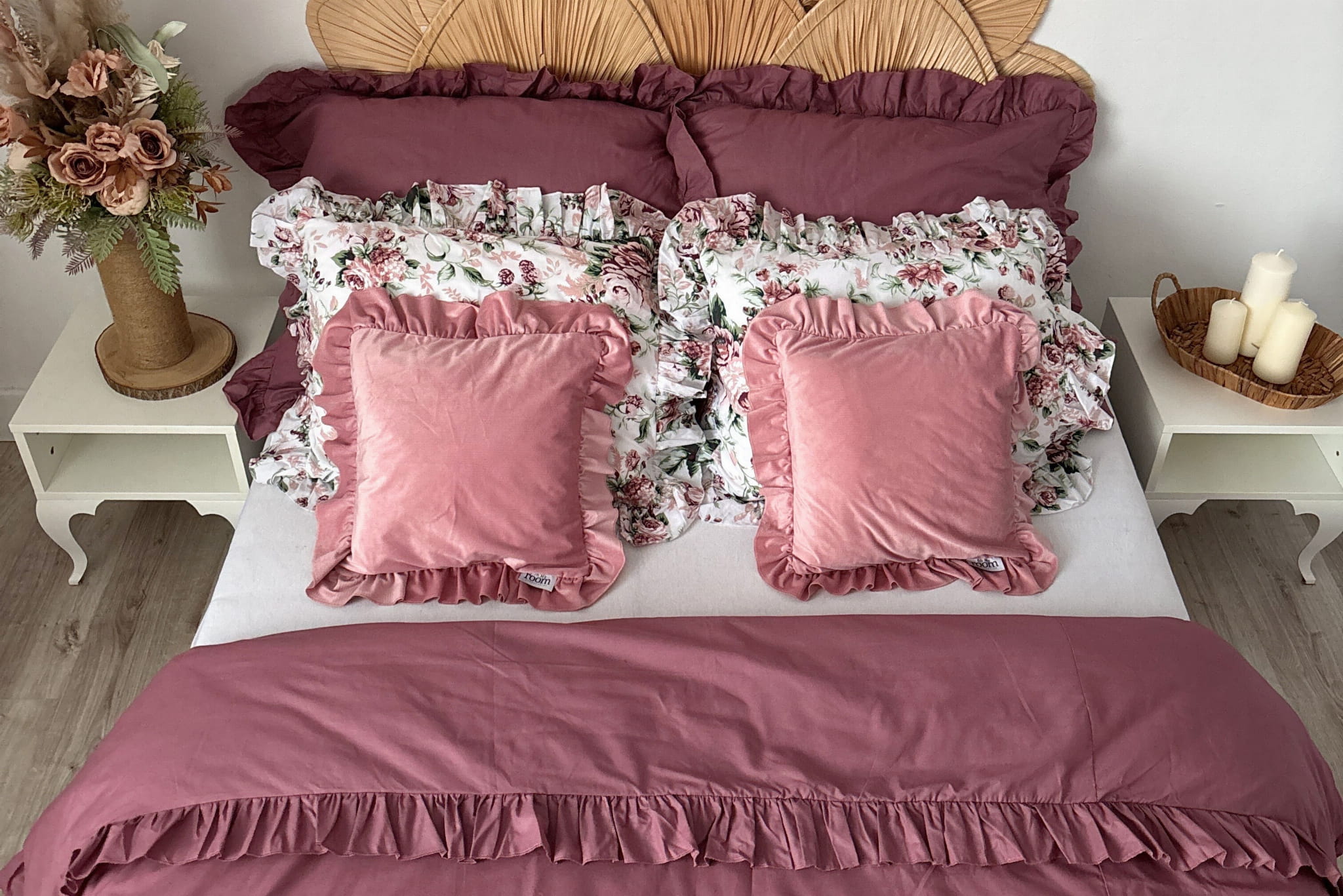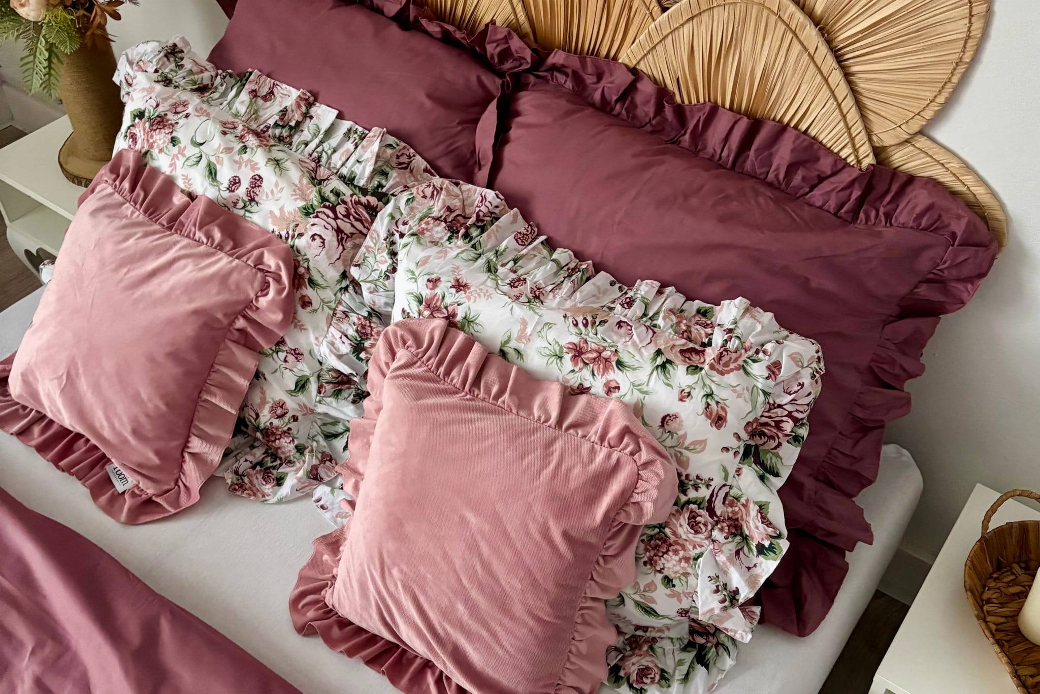 Cotton bedding with a frill made of the highest quality cotton material with the oeko-tex 1000 certificate. The bedding has a sewn frill on each side in both pillowcases (pillow and quilt). The bedding is closed with strings. In addition, it has a strip sewn inside, thanks to which it will be easy to hide the bedding and it will not protrude during use.