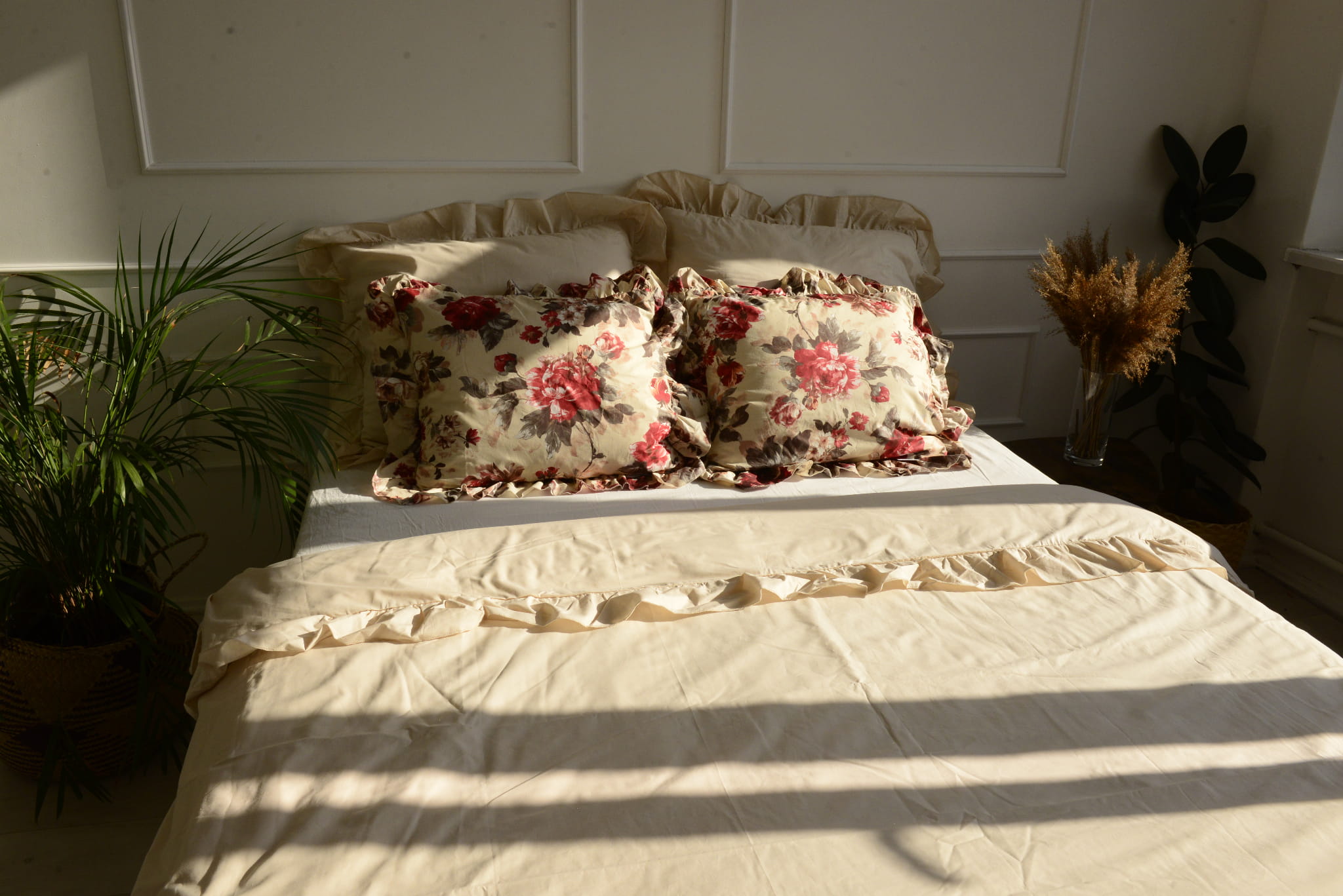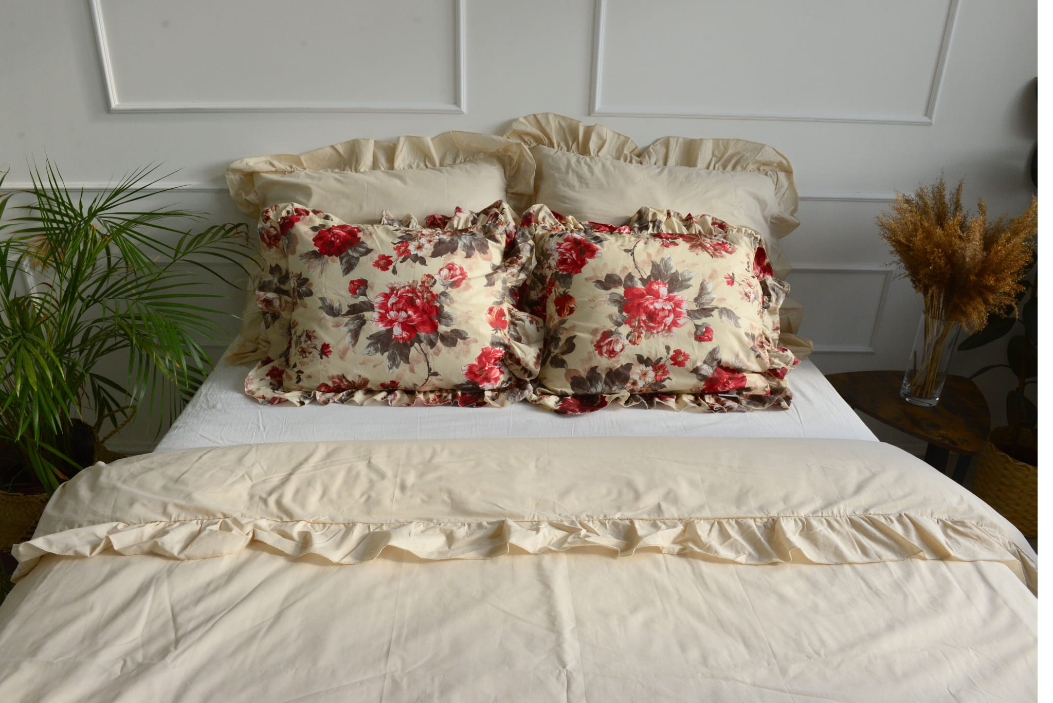 Cotton bedding with a frill made of the highest quality cotton material with the oeko-tex 1000 certificate. The bedding has a sewn frill on each side in both pillowcases (pillow and quilt). The bedding is closed with strings. In addition, it has a strip sewn inside, thanks to which it will be easy to hide the bedding and it will not protrude during use.