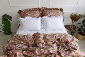 Cotton bedding with a frill made of the highest quality cotton material with the oeko-tex 1000 certificate. The bedding has a sewn frill on each side in both pillowcases (pillow and quilt). The bedding is closed with strings. In addition, it has a strip sewn inside, thanks to which it will be easy to hide the bedding and it will not protrude during use.