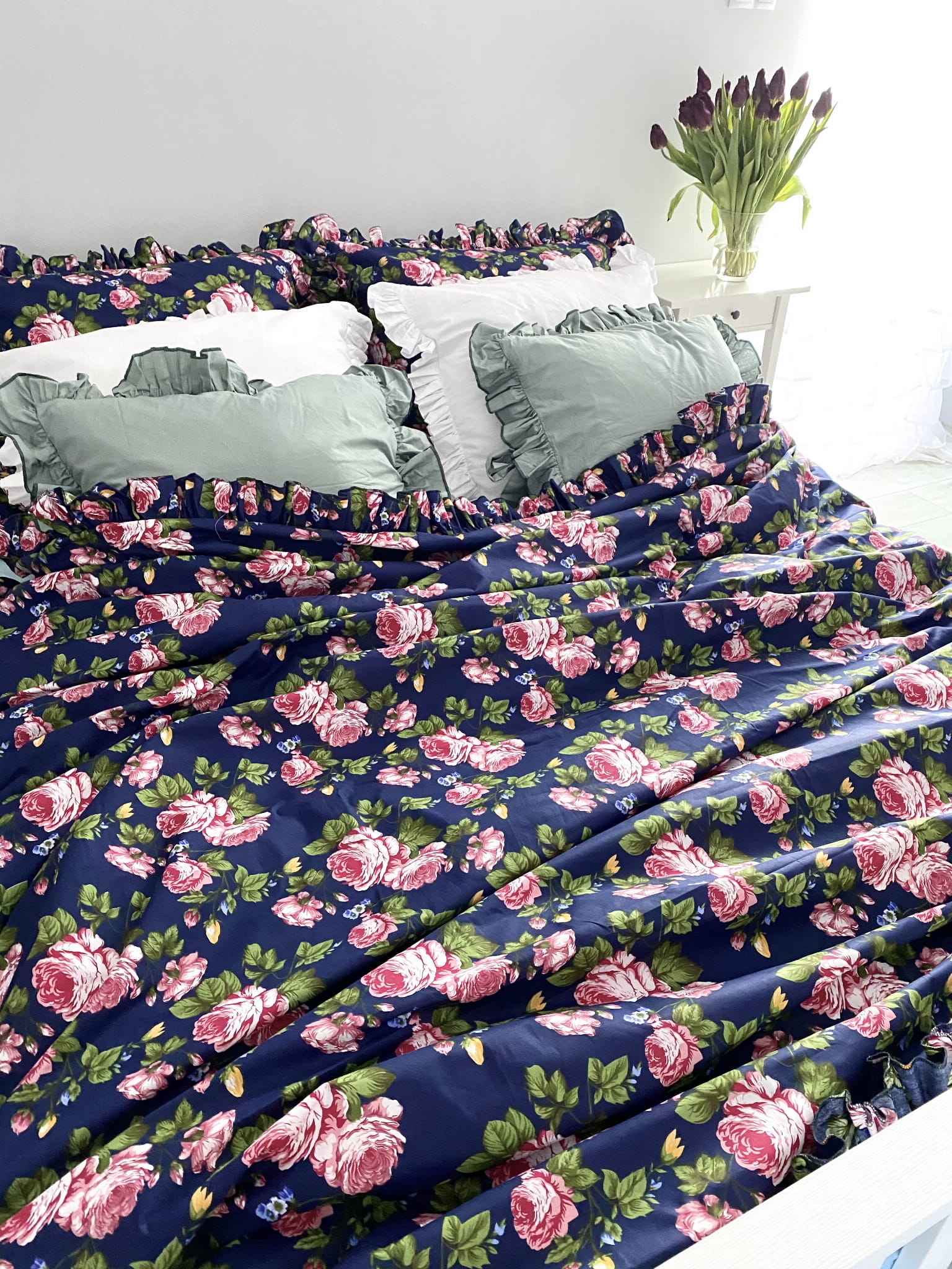 Cotton bedding with a frill made of the highest quality cotton material with the oeko-tex 1000 certificate. The bedding has a sewn frill on each side in both pillowcases (pillow and quilt). The bedding is closed with strings. In addition, it has a strip sewn inside, thanks to which it will be easy to hide the bedding and it will not protrude during use.