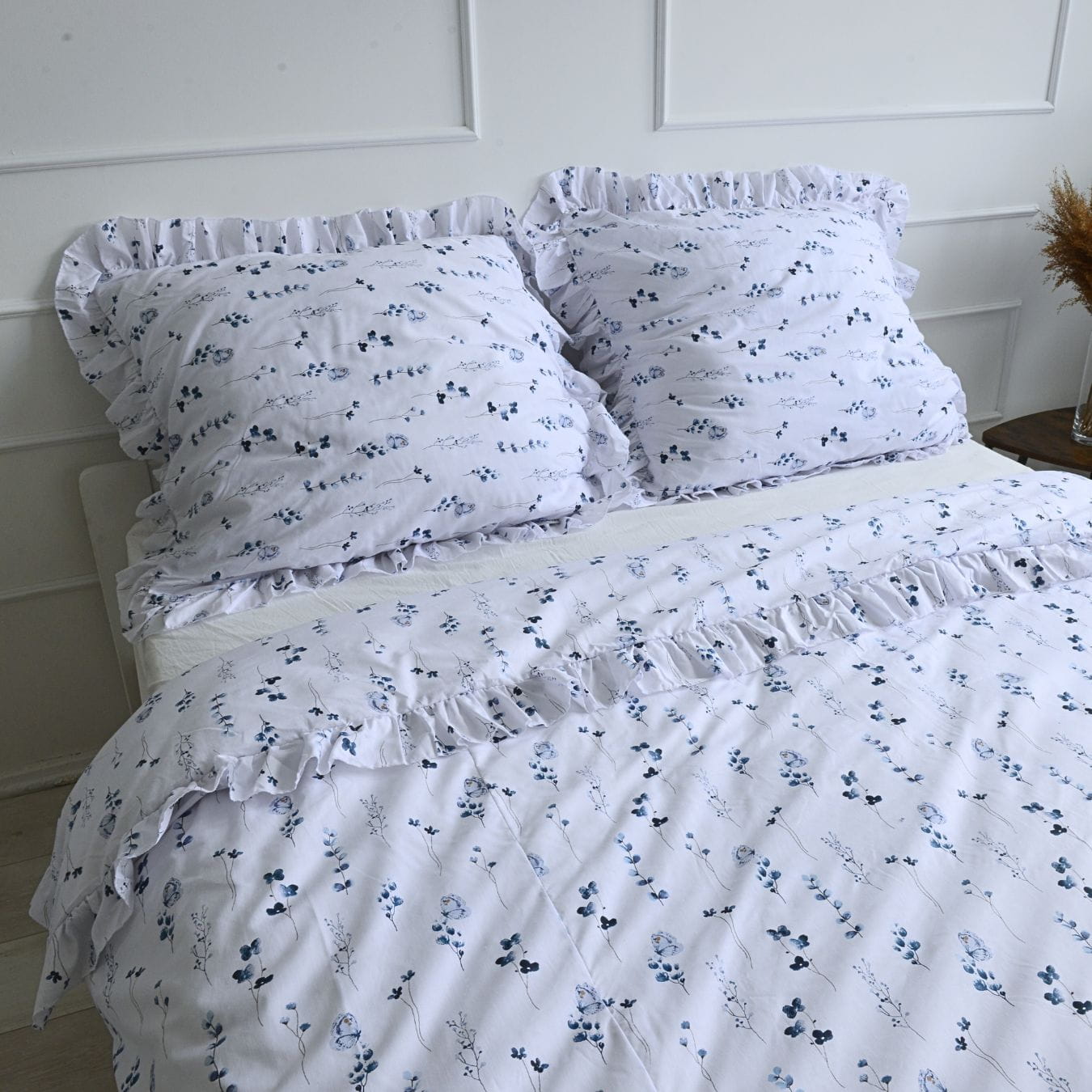 Cotton pillowcase with a frill made of the highest quality cotton material with the Oeko-Tex 1000 certificate.The pillowcase is closed with bow. In addition, it has a sewn-in strip, thanks to which it will be easy to hide the bedding and will not protrude during use.
