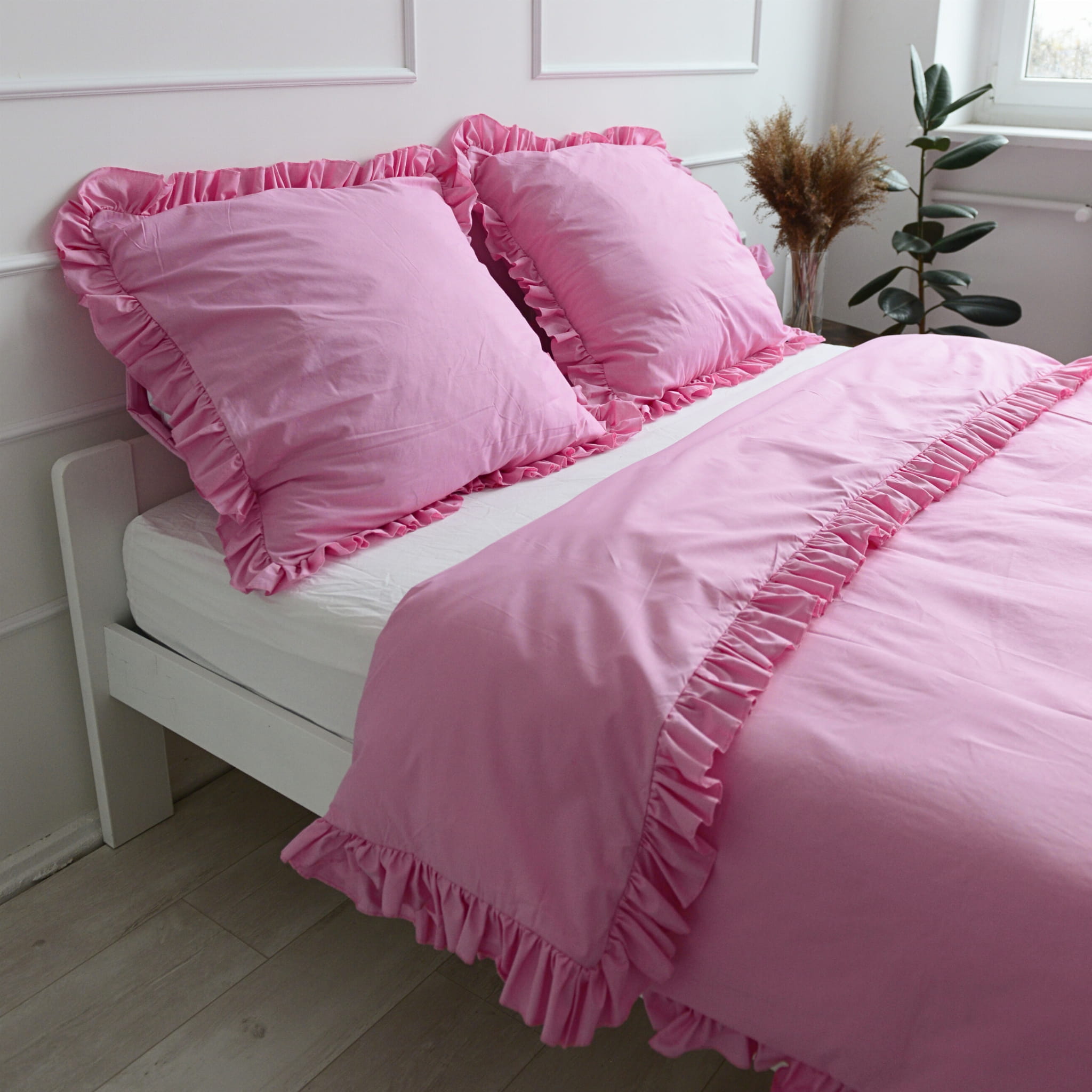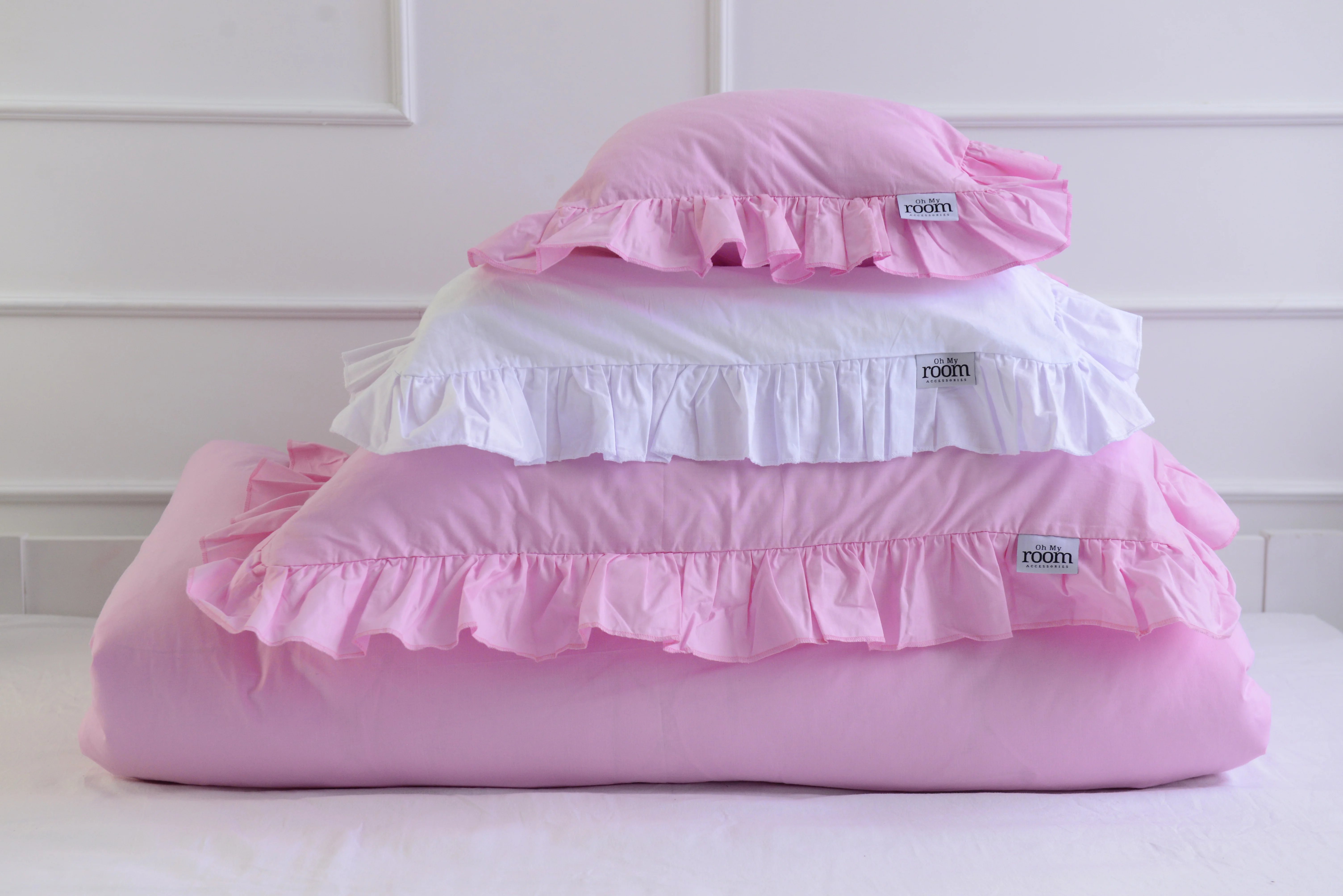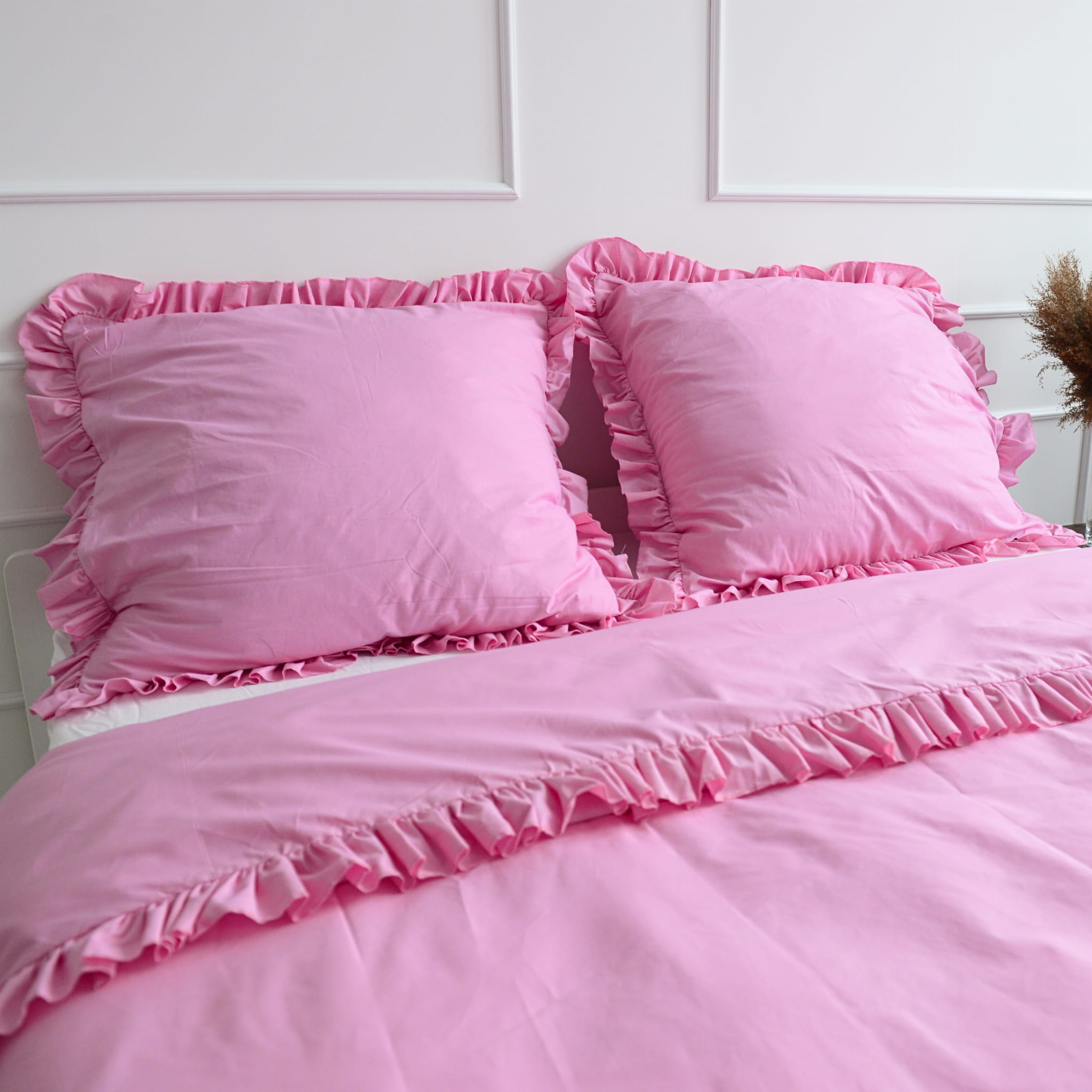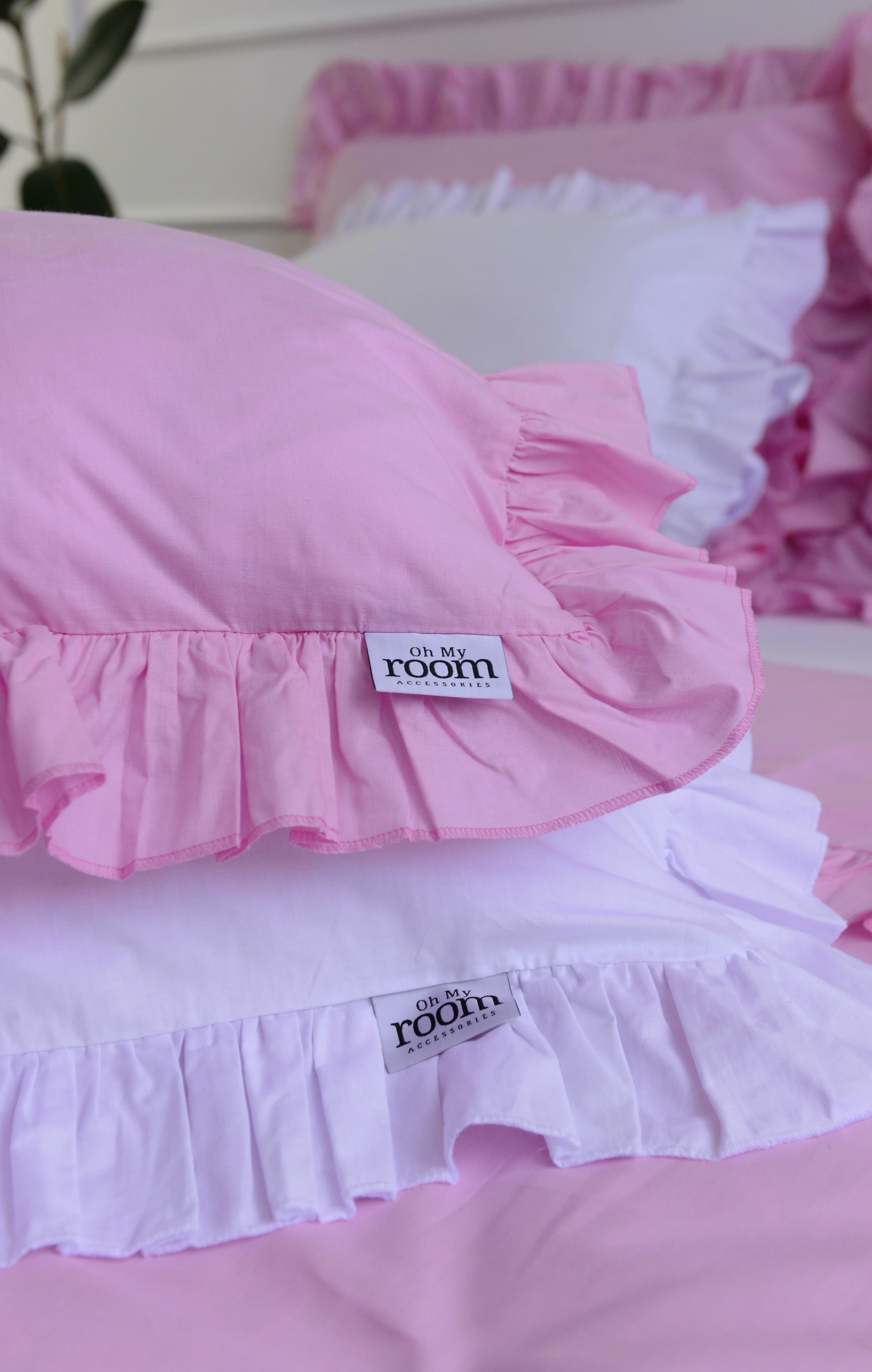 Cotton pillowcase with a frill made of the highest quality cotton material with the Oeko-Tex 1000 certificate.The pillowcase is closed with bow. In addition, it has a sewn-in strip, thanks to which it will be easy to hide the bedding and will not protrude during use.