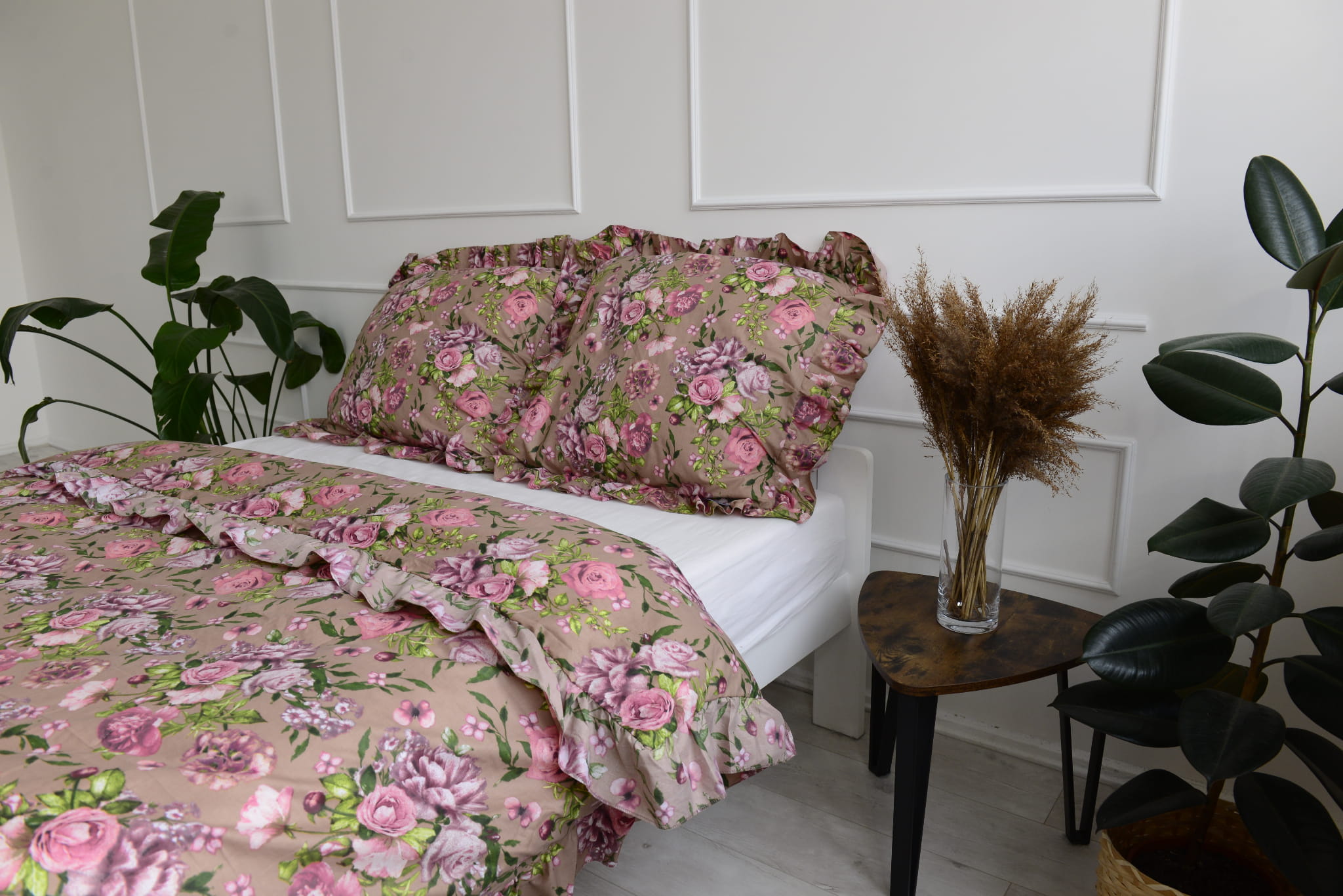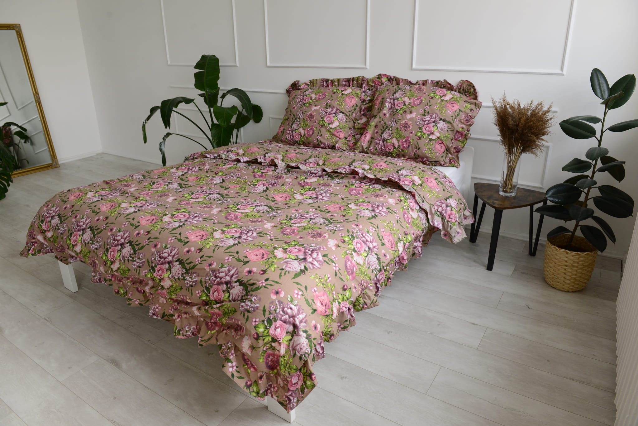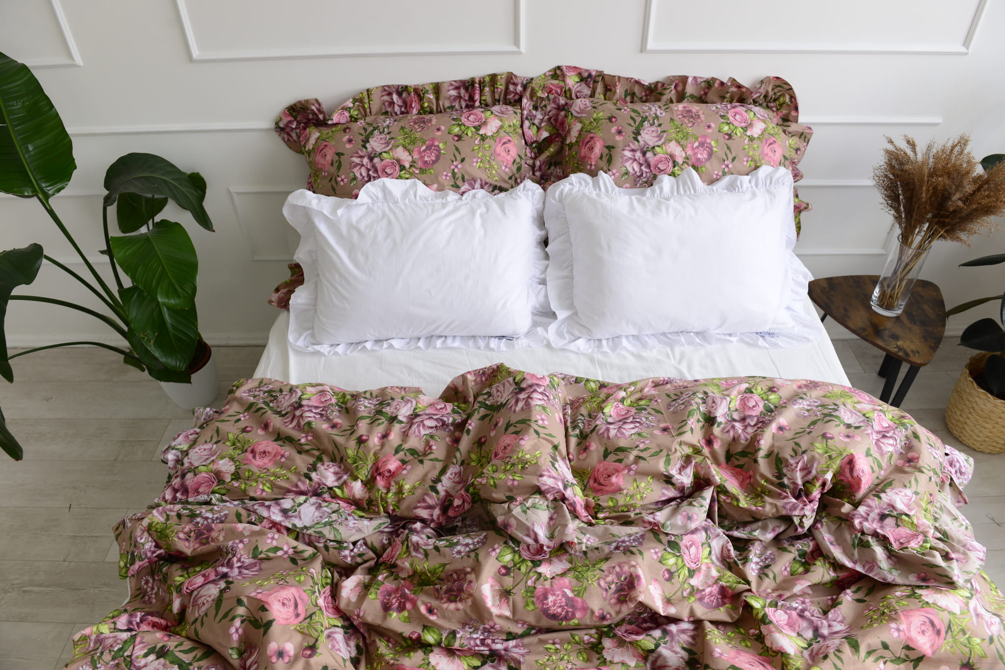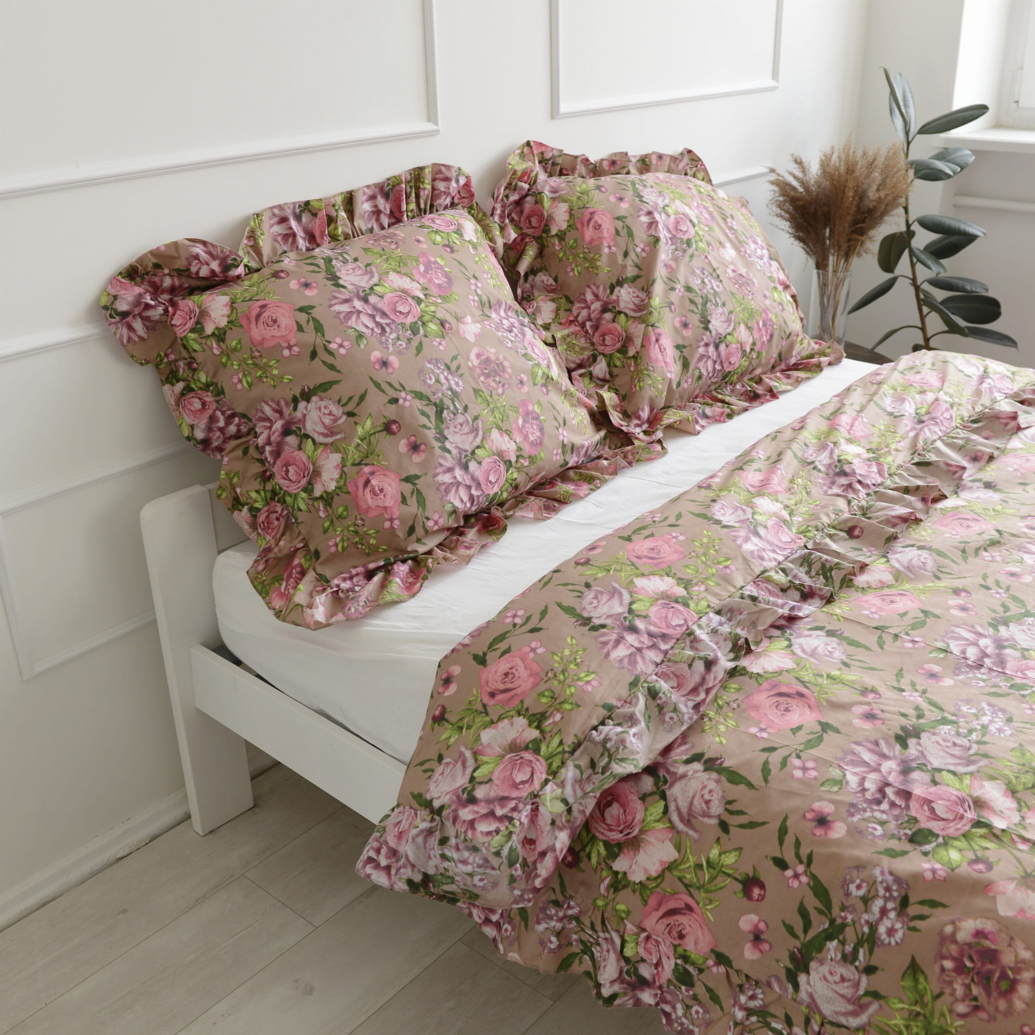 Cotton bedlinen with ruffle pink flowers