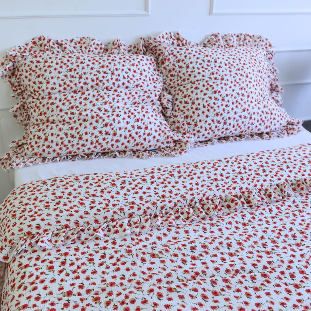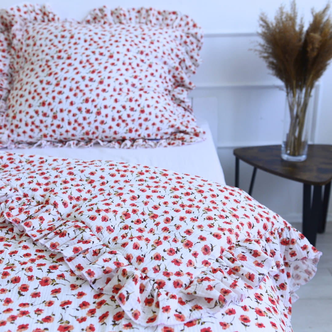 Cotton pillowcase with a frill made of the highest quality cotton material with the Oeko-Tex 1000 certificate.The pillowcase is closed with bow. In addition, it has a sewn-in strip, thanks to which it will be easy to hide the bedding and will not protrude during use.