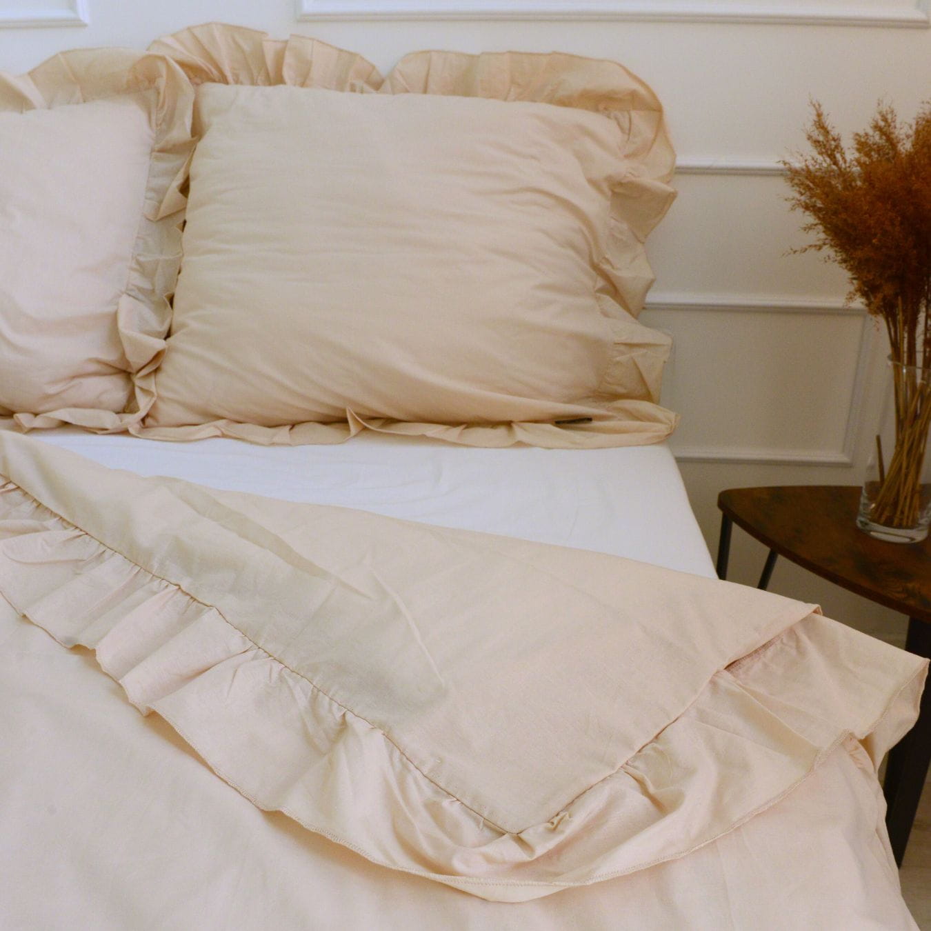 Cotton bedding with a frill made of the highest quality cotton material with the oeko-tex 1000 certificate. The bedding has a sewn frill on each side in both pillowcases (pillow and quilt). The bedding is closed with strings. In addition, it has a strip sewn inside, thanks to which it will be easy to hide the bedding and it will not protrude during use.