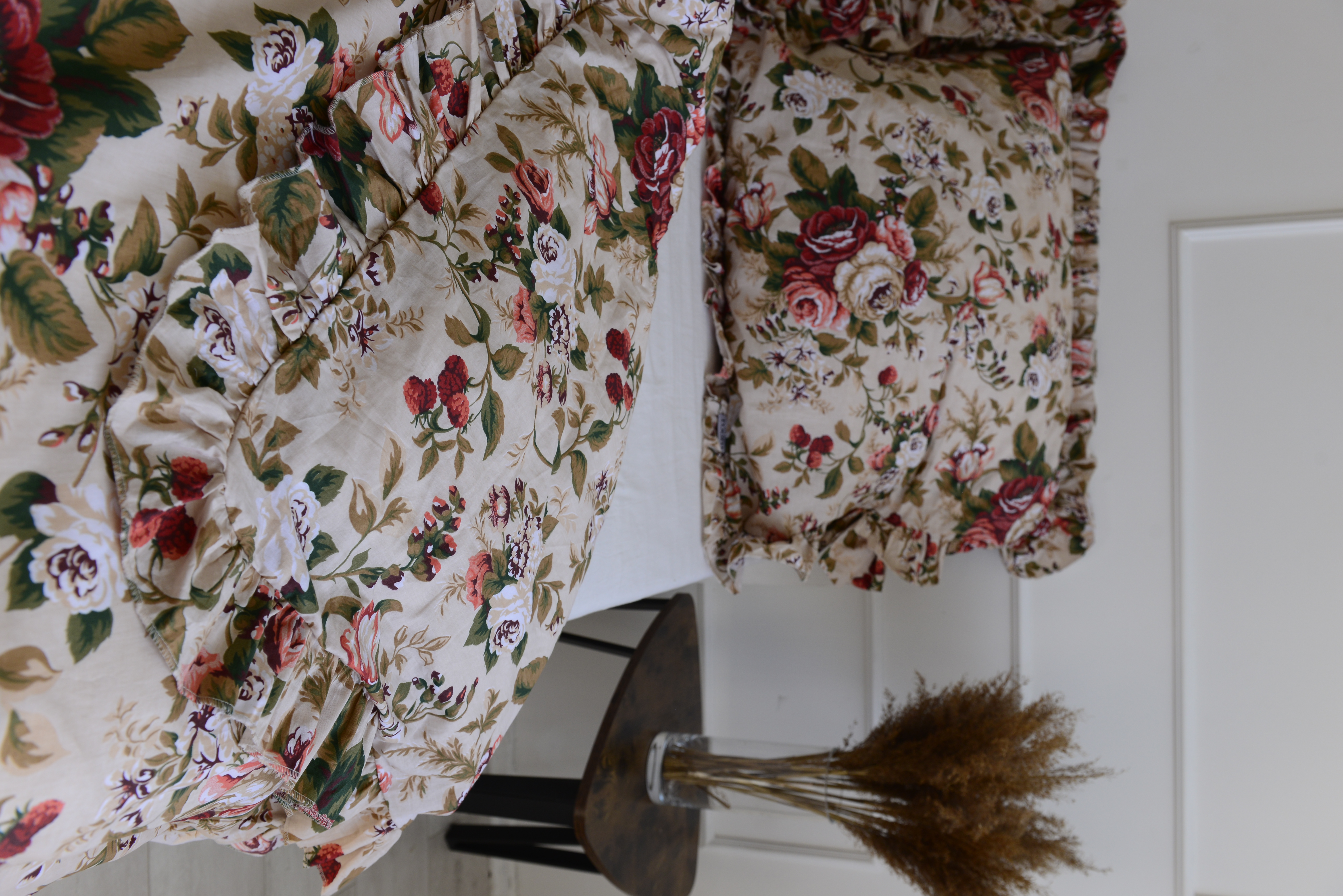 Róże i maliny – kwiatowy wzór pełen energii i koloru. Świetnie pasuje do wnętrz w stylu cottagecore, rustykalnym czy romantycznym. Połącz ją z pastelowymi poduszkami, miękkim pledem i świeżymi kwiatami w wazonie, aby stworzyć atmosferę letniego ogrodu w swojej sypialni.