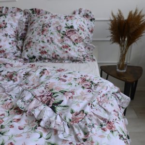 Pościel posiada wszytą falbankę z każdej strony w obu poszewkach (poduszka i kołdra). Pościel jest zamykana na troczki.