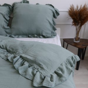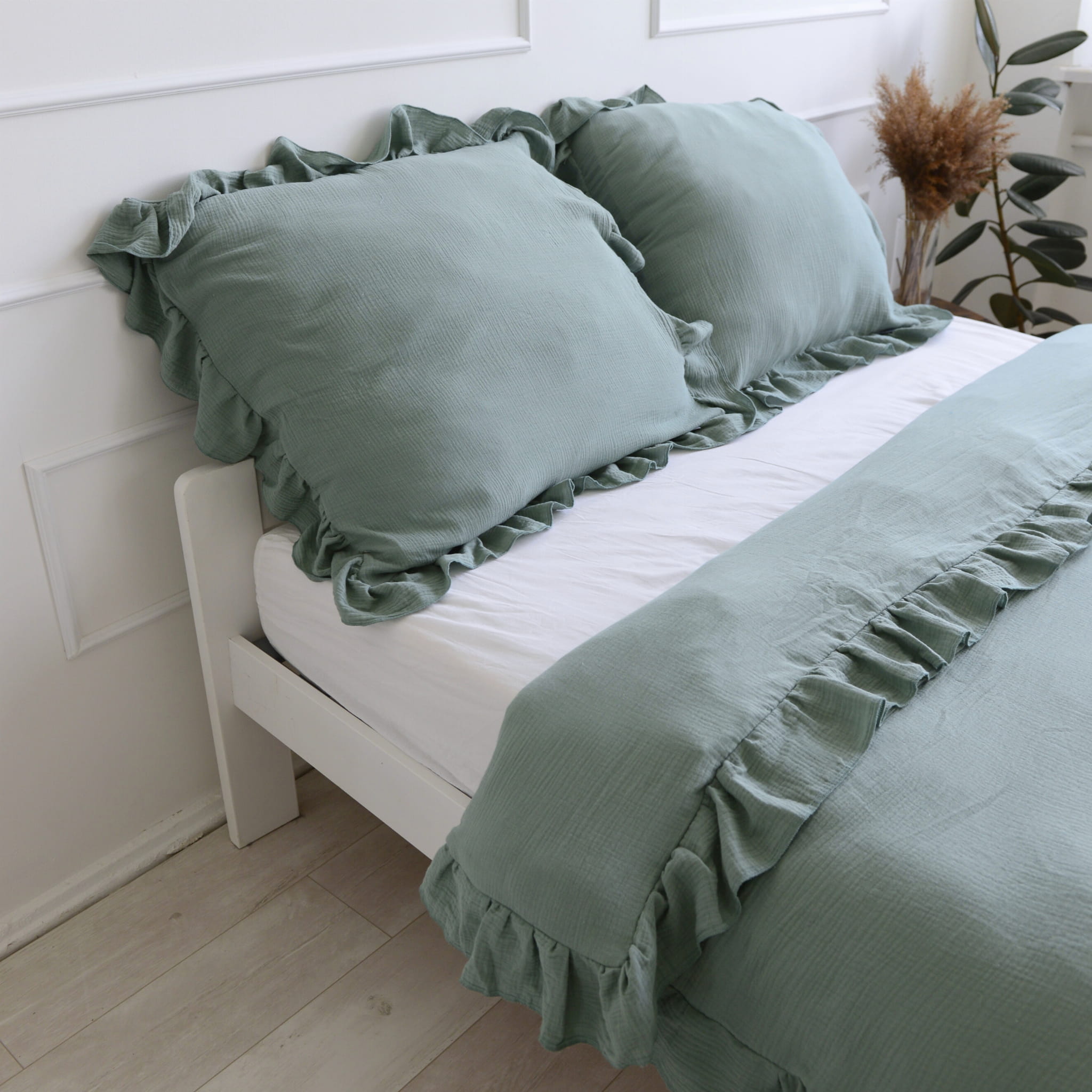 Pościel muślinowa z falbanką boho zieleń - rozmiar 160x200